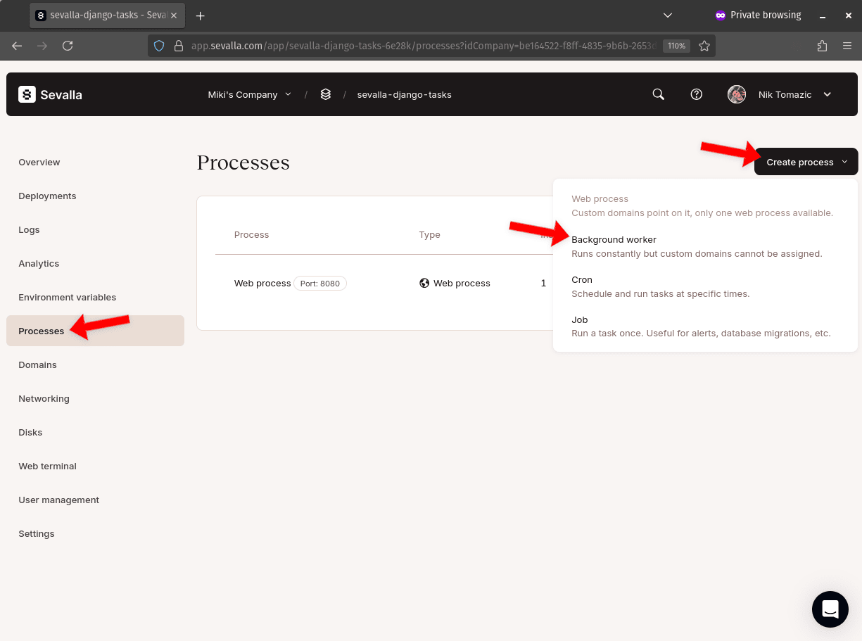 Navigate back to your Django web service, select Processes on the sidebar, then Create process, and finally Background process.