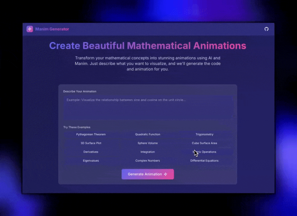 - Instant Creation: Type your mathematical concept in natural English → Get a beautiful animation in seconds